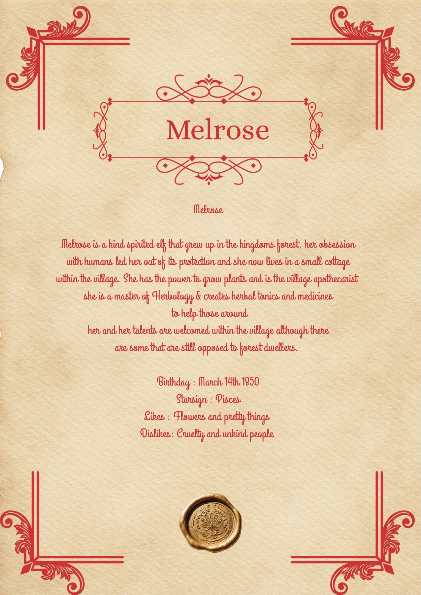 Melrose is a kind spirited elf that grew up in the kingdoms forest, her obsession with humans led her out of its protection and she now lives in a small cottage within the village. She has the power to grow plants and is the village apothecarist's she is a master of Herbology & creates herbal tonics and medicines to help those around her and her talents are welcomed within the village although there are some that are still opposed to forest dwellers.